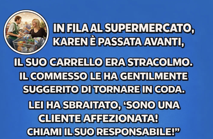In fila al supermercato, Karen si infilò avanti con il carrello pieno fino all’orlo. La cassiera le suggerì gentilmente di mettersi in fondo. Lei gridò: “Sono una cliente abituale! Chiamate il responsabile!” Le persone dietro mormorarono infastidite. Io rimasi fermo al mio posto, ma il viso di Karen diventò paonazzo mentre tirava fuori il telefono: “Riprenderò questa ingiustizia e farò sapere tutto a tutti!”