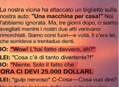 Era fissato con cura sotto il tergicristallo, impossibile non notarlo. Io e mio marito lo guardammo perplessi. Vivevamo in una strada suburbana tranquilla, dove il parcheggio non era mai stato un problema. Avevamo due auto, entrambe regolarmente registrate, entrambe parcheggiate davanti a casa nostra come avevamo sempre fatto. Pensammo a un malinteso, forse persino a uno scherzo. Dopotutto, non esisteva alcuna regola di quartiere o ordinanza comunale che limitasse il numero di veicoli. Buttai il biglietto, ridemmo dell’ennesimo vicino brontolone e continuammo la nostra settimana.