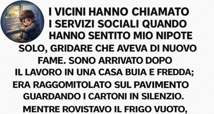 I vicini avevano chiamato i servizi sociali quando avevano sentito mio nipote urlare da solo che aveva di nuovo fame. Sono arrivata dopo il lavoro e ho trovato la casa al buio e gelida; era rannicchiato sul pavimento, a guardare cartoni animati senza audio. Mentre cercavo qualcosa nel frigorifero vuoto, i suoi occhi pieni di speranza hanno incontrato i miei.