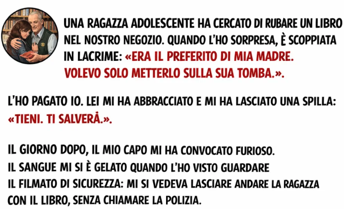 Non sapevo cosa rispondere. Le regole del negozio—chiamare la polizia, fare un rapporto—mi sono sembrate improvvisamente fredde, disumane. Così ho preso il libro dal suo zaino, sono andato alla cassa e l’ho pagato io.