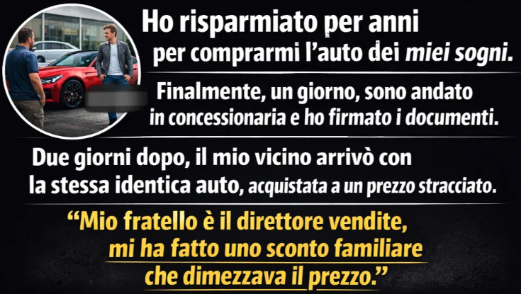 Ho risparmiato per anni per comprarmi l’auto dei miei sogni. Finalmente, un giorno, sono andato in concessionaria e ho firmato i documenti. Due giorni dopo, il mio vicino arrivò con la stessa identica auto, acquistata a un prezzo stracciato. Sorrise con compiacimento quando gli chiesi come avesse fatto. Scoprii che suo fratello era il direttore vendite e gli aveva applicato uno sconto familiare che dimezzava il prezzo.