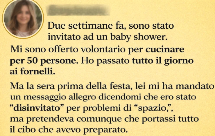 Mi aveva togliato dalla lista degli invitati… ma voleva ancora il mio cibo.