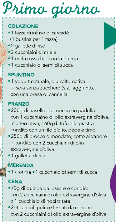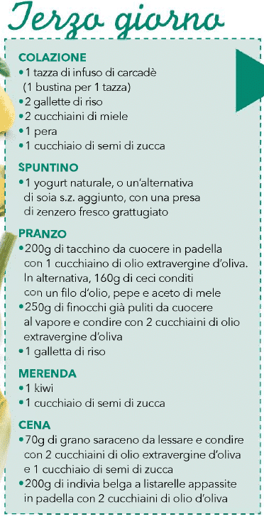 A dottare periodicamente un breve programma depurativo non solo aiuta a mantenere gli organi come fegato, intestino e reni in salute, ma consente anche di ridurre o addirittura eliminare gli accumuli di scorie, tossine, liquidi e grasso. Ecco perché tutti i mesi apriamo il programma snellente con i tre giorni detox, pensati ogni volta in modo tale da adattarsi alla stagione. Questo mese, per esempio, puntiamo sui principi amari di carciofi, cime di rapa, radicchio rosso e indivia belga, ma anche sugli elementi antiritenzione dei carciofi, delle mele e dei kiwi, così come sui grassi buoni dei semi di zucca e sui loro minerali antinfiammatori come potassio e zinco.