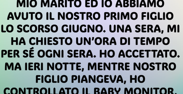 Io e mio marito abbiamo avuto il nostro primo bambino lo scorso giugno. Una sera, mi chiese un’ora di tempo da solo ogni notte. Accettai. Ma ieri sera, mentre nostro figlio piangeva, ho controllato il baby monitor. Non...