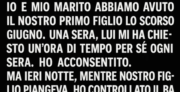 Io e mio marito abbiamo avuto il nostro primo figlio lo scorso giugno. Una sera, lui mi ha chiesto un’ora di tempo da solo ogni notte. Ho accettato. Ma ieri sera, mentre nostro figlio piangeva, ho controllato il baby...