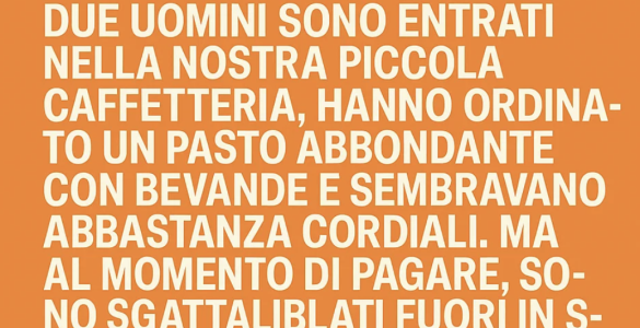 Due uomini entrarono nel nostro piccolo café, ordinarono un grande pasto con bevande e sembrarono abbastanza cordiali. Ma quando giunse il momento di pagare, uscirono silenziosamente dalla porta. La mia collega era in...