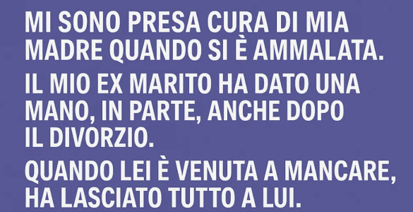 Mi sono presa cura di mia madre quando si è ammalata. Dopo il divorzio, il mio ex marito ha dato una mano, ogni tanto. Quando lei è morta, ha lasciato tutto a lui. E qualcosa, dentro di me, si è spezzato. Così ho...