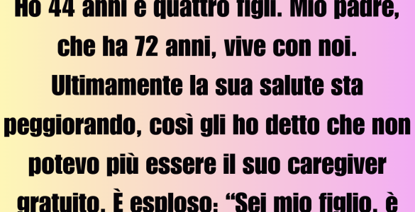 Ho 44 anni e ho quattro figli. Mio padre, che ha 72 anni, vive con noi. Negli ultimi tempi, la sua salute è peggiorata, così gli ho detto che non potevo essere la sua badante gratuita. Lui è esploso: “Sei mio figlio, è...