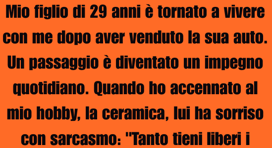 Mio figlio, 29 anni, è tornato a casa dopo aver venduto la sua auto. Un passaggio ogni tanto si è trasformato in un impegno quotidiano. Quando ho nominato il mio hobby, la ceramica, ha sorriso con sarcasmo: “Tanto tieni...