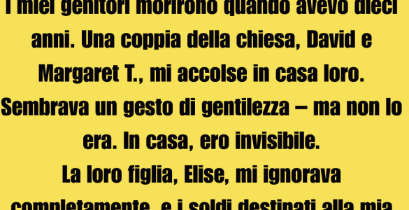 I miei genitori morirono in un incidente con fuga quando avevo dieci anni. Una coppia della chiesa, David e Margaret T., mi accolse. Sembrava un atto di bontà – ma non lo era. In casa, ero invisibile. La loro figlia...