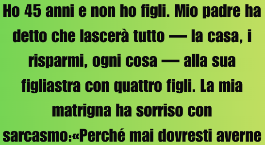 Ho 45 anni e non ho figli.Mio padre ha detto che lascerà tutto — la casa, i risparmi, ogni cosa — alla sua figliastra con quattro figli.La mia matrigna ha sorriso con aria beffarda:«Perché mai dovresti averne bisogno...