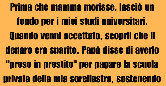 Prima che mia madre ci lasciasse, aveva messo da parte un fondo per il college per me. Quando sono stata accettata, ho scoperto che il denaro era sparito. Mio padre ha detto di averlo “preso in prestito” per...