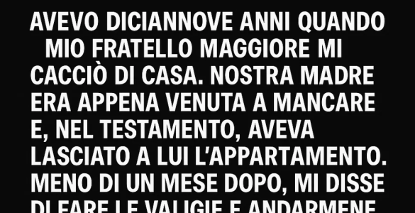 Avevo diciannove anni quando mio fratello maggiore mi mise alla porta. Nostra madre era appena morta e, nel testamento, gli aveva lasciato l’appartamento. Meno di un mese dopo, mi disse di fare le valigie e...