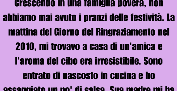 Sono cresciuto nella povertà, e nella mia famiglia i pasti delle feste non esistevano. La mattina del Giorno del Ringraziamento del 2010 ero a casa di un’amica, e il profumo del cibo che riempiva la cucina era...