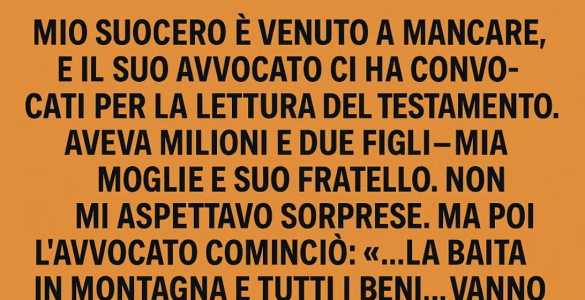 Mio suocero è venuto a mancare, e l’avvocato di famiglia ci ha convocati per la lettura del testamento. Aveva milioni di dollari e due figli: mia moglie, Rina, e suo fratello, Orson. Non mi aspettavo nulla di...