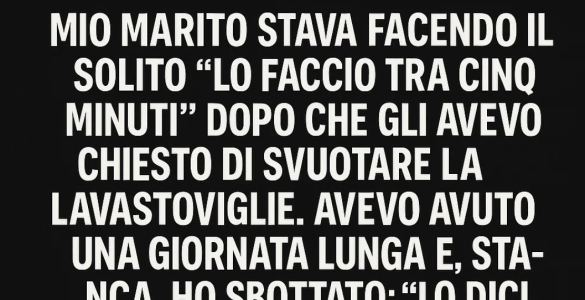 Mio marito faceva la solita scenetta del “Tra cinque minuti” dopo che gli avevo chiesto di svuotare la lavastoviglie. Avevo avuto una giornata pesante e, stanca, sono sbottata: «Lo dici sempre e non lo fai mai! Non sono...