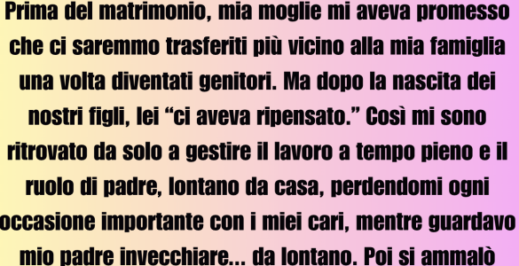Prima del matrimonio, mia moglie mi aveva promesso che, una volta diventati genitori, ci saremmo trasferiti più vicino alla mia famiglia. Ma dopo la nascita dei nostri figli, cambiò idea. Così mi ritrovai a gestire...