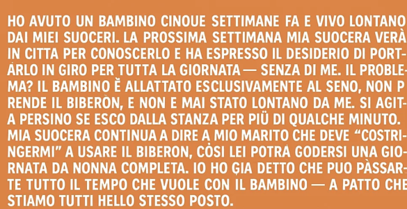 Ho partorito cinque settimane fa e vivo lontano dalla famiglia di mio marito. La prossima settimana mia suocera verrà in città per conoscere il bambino e ha chiesto di poterlo portare in giro da sola per tutta la...