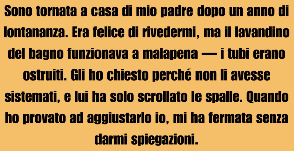 Dopo un anno lontana, sono tornata a casa di mio padre. Era contento di rivedermi, ma il lavandino del bagno funzionava a malapena: i tubi erano intasati. Gli chiesi perché non li avesse sistemati, e lui si limitò a...
