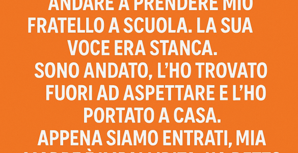 Ho ricevuto una chiamata da mia madre. Mi chiedeva di andare a prendere mio fratello a scuola.La sua voce era stanca. Sono andato, l’ho trovato ad aspettarmi fuori e l’ho portato a casa.Ma appena siamo entrati, mia...