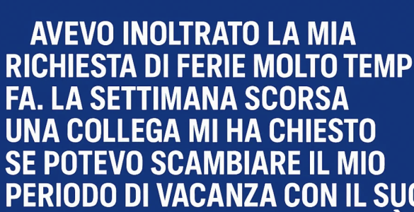 Avevo inoltrato la richiesta di ferie mesi fa. Tutto era stato approvato, e avevo già prenotato ogni dettaglio. La settimana scorsa, però, una collega mi ha chiesto se potevo scambiare il mio periodo con il suo.Le ho...