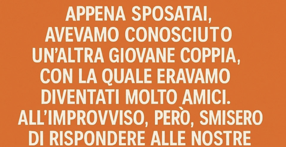 Appena sposati, conoscemmo un’altra giovane coppia, con la quale stringemmo subito una profonda amicizia.Poi, all’improvviso, smisero di rispondere alle nostre chiamate. Mio marito mi disse: «Lascia perdere, tesoro».Tre...