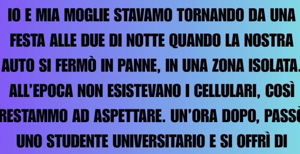 Io e mia moglie stavamo tornando da una festa alle due di notte quando l’auto si fermò in panne, in una zona isolata. All’epoca non c’erano i cellulari, quindi restammo lì ad aspettare.Dopo circa un’ora, passò uno...