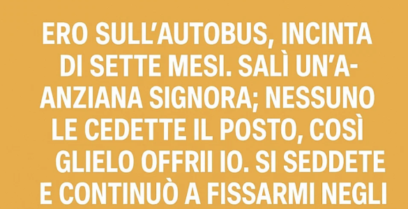 Ero sull’autobus, incinta di sette mesi. Salì un’anziana signora; nessuno si alzò per cedergli il posto, così lo feci io. Si sedette e continuò a fissarmi negli occhi. Quando scese, infilò qualcosa di pesante nella mia...