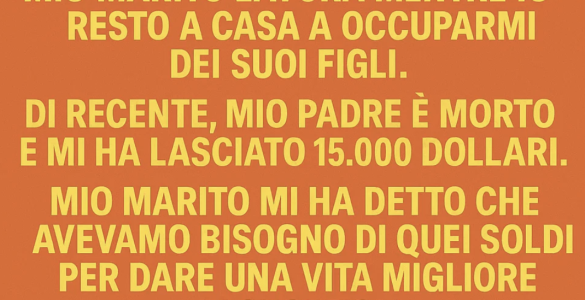 Mio marito lavora mentre io resto a casa a occuparmi dei suoi figli. Di recente, mio padre è morto e mi ha lasciato 15.000 dollari. Mio marito mi ha detto che avevamo bisogno di quei soldi per offrire una vita migliore...