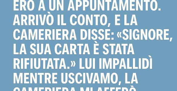 Ero a un appuntamento.Quando arrivò il conto, la cameriera disse:«Mi dispiace, signore, la sua carta è stata rifiutata.» Lui impallidì. Mentre uscivamo, la cameriera mi afferrò il braccio e sussurrò:«Ho mentito.» Mi...