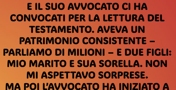 Mia suocera era venuta a mancare, e l’avvocato ci aveva convocati per la lettura del testamento. Aveva un patrimonio ingente — parliamo di milioni — e due figli: mio marito e sua sorella. Non mi aspettavo sorprese. Ma...