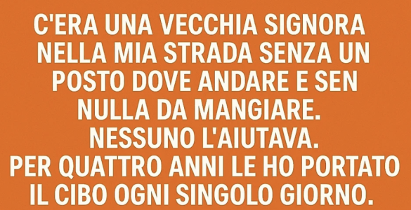 C’era una vecchia signora nella mia strada, senza un posto dove andare e senza nulla da mangiare. Nessuno l’aiutava. Per quattro anni le ho portato cibo ogni singolo giorno. I miei vicini mi guardavano come se fossi...