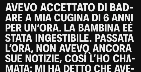 Avevo accettato di occuparmi della figlia di mia cugina, una bambina di sei anni, solo per un’ora. La bambina era ingestibile. Scaduto il tempo, non avendo sue notizie, l’ho chiamata. Mi ha risposto dicendo che aveva...