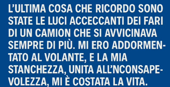 L’ultima cosa che ricordo sono state le luci accecanti dei fari di un camion che si avvicinava sempre di più. Mi ero addormentato al volante, e la mia stanchezza, unita all’incoscienza, mi è costata la vita. All’inizio...