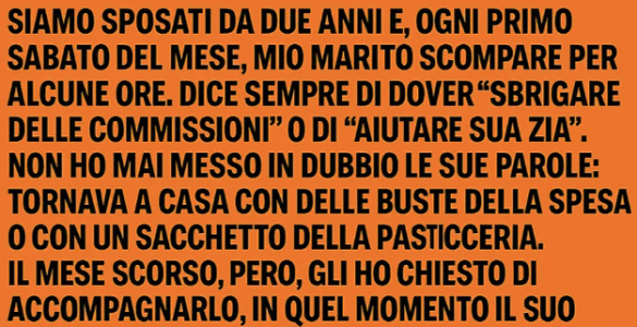 Siamo sposati da due anni e, ogni primo sabato del mese, mio marito scompare per alcune ore. Dice sempre di dover “sbrigare delle commissioni” o di “aiutare sua zia”. Non ho mai dubitato delle sue parole: tornava a casa...