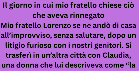Mio fratello Lorenzo se ne andò di casa all’improvviso, senza salutare, dopo un litigio furioso con i nostri genitori. Si trasferì in un’altra città con Claudia, una donna che lui descriveva come “la sua unica ragione...