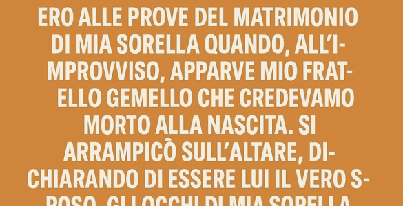 Ero alle prove del matrimonio di mia sorella quando, all’improvviso, apparve mio fratello gemello, che tutti avevamo creduto morto alla nascita. Salì sull’altare e dichiarò di essere lui il vero sposo. Gli occhi di mia...