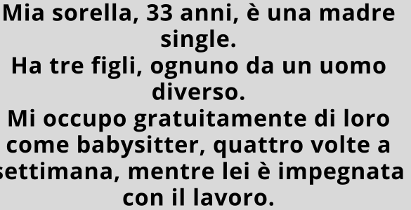 Mia sorella, 33 anni, è una madre single. Ha tre figli, ciascuno da un uomo diverso. Mi occupo di loro gratuitamente come babysitter, quattro volte a settimana, mentre lei è impegnata con il lavoro. Recentemente, mio...