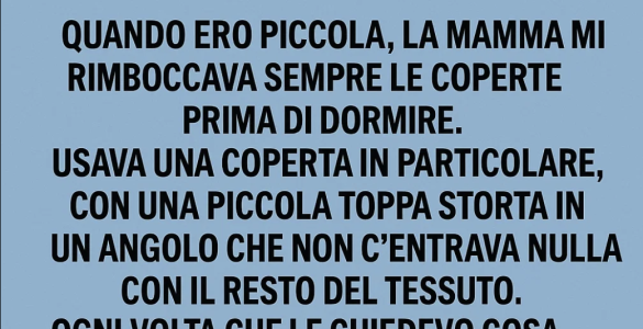 Quando ero piccola, la mamma mi rimboccava sempre le coperte con una coperta particolare. Aveva una piccola toppa irregolare in un angolo, fatta con un tessuto che non c’entrava nulla col resto. Ogni volta che le...
