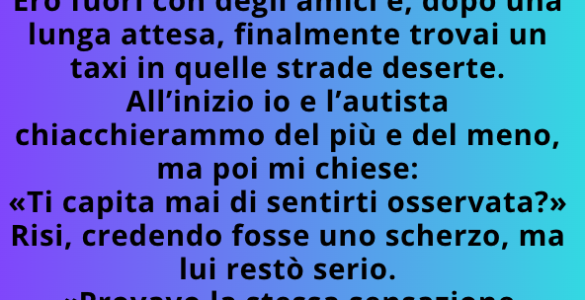 All’inizio io e il tassista chiacchierammo un po’, nulla di strano. Poi mi chiese: «Ti capita mai di sentirti osservata?» Risi, pensando fosse una battuta mal riuscita. Ma i suoi occhi, riflessi nello specchietto...