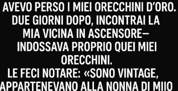 Avevo perso i miei orecchini d’oro. Due giorni dopo, incontrai la mia vicina in ascensore—li indossava. Mi disse: «Me li ha regalati il mio ragazzo.» Le risposi che erano vintage, appartenuti alla nonna di mio marito...