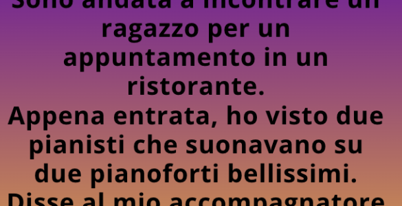 Entrai nel ristorante dove avevo appuntamento. Appena varcata la soglia, notai due pianisti che suonavano su due splendidi pianoforti. Dissi alla mia accompagnatrice quanto fosse affascinante vedere due musicisti...