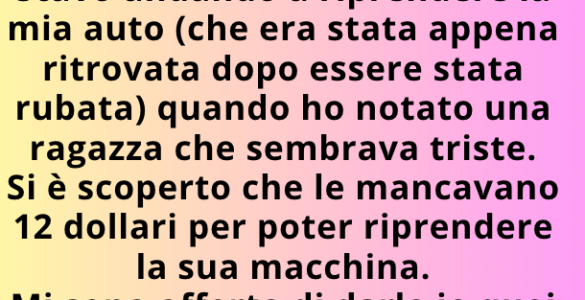 Stavo andando a riprendere la mia auto (che era stata ritrovata dopo essere stata rubata) quando ho visto una ragazza dall’aria triste. Si è scoperto che le mancavano 12 dollari per poter riavere la sua macchina. Mi...