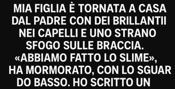 Mia figlia è tornata a casa dal padre con dei brillantini nei capelli e uno strano sfogo sulle braccia. «Abbiamo fatto lo slime», ha mormorato, lo sguardo basso. Ho scritto subito al mio ex, furiosa, ma lui ha detto di...