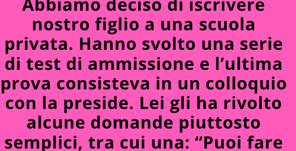 Avevamo deciso di iscrivere nostro figlio a una scuola privata. Hanno svolto una serie di test di ammissione e l’ultima prova era un colloquio con la preside. Le domande erano piuttosto semplici, tra cui: “Puoi fare lo...