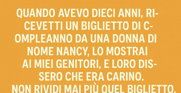Avevo dieci anni quando ricevetti un biglietto di compleanno da una donna di nome Nancy. Lo mostrai ai miei genitori, e lo trovarono carino. Non lo rividi mai più. Vent’anni dopo, alla morte di mio padre, ritrovai quel...