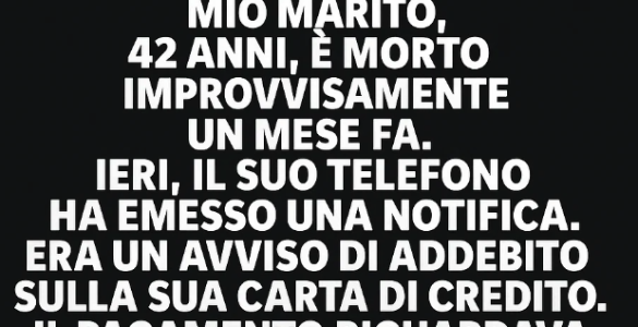Mio marito, 42 anni, è morto improvvisamente un mese fa. Ieri, il suo telefono ha emesso una notifica. Era un addebito sulla sua carta di credito. Il pagamento riguardava una camera d’albergo, effettuato solo pochi...
