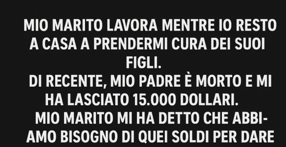 Mio marito lavora, mentre io resto a casa e mi occupo dei suoi figli. Di recente, mio padre è morto e mi ha lasciato 15.000 dollari. Mio marito ha detto che avevamo bisogno di quei soldi per offrire una vita migliore ai...