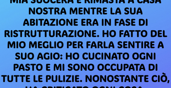 Mia suocera ha vissuto con noi durante i lavori di ristrutturazione della sua abitazione. Ho fatto di tutto per farla sentire a casa: ho cucinato ogni pasto, ho pulito dopo di lei, mi sono impegnata in ogni dettaglio...