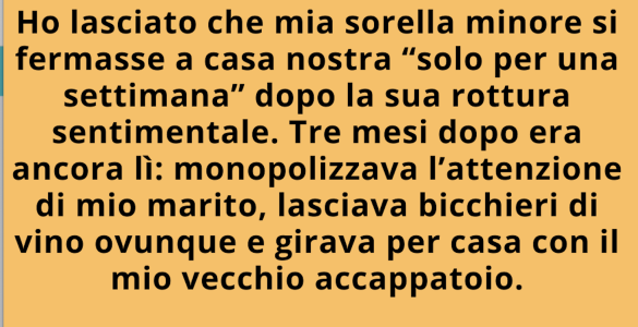 Avevo accettato che mia sorella minore restasse da noi “solo per una settimana” dopo la fine della sua relazione. Tre mesi dopo era ancora lì: monopolizzava l’attenzione di mio marito, lasciava bicchieri di vino ovunque...